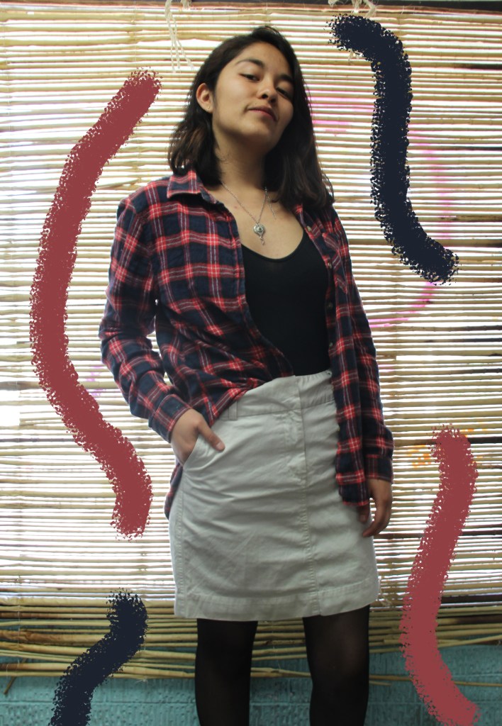 La segunda idea consiste en combinar la falda blanca de las fotos de abajo con una camisa de cuadros. Puedes hacer este outfit más fresco quitándole las medias, eso ya dependerá de tu gusto. Un tip que te puedo dar es fajar sólo un lado de la camisa, le dará el toque a tu outfit.